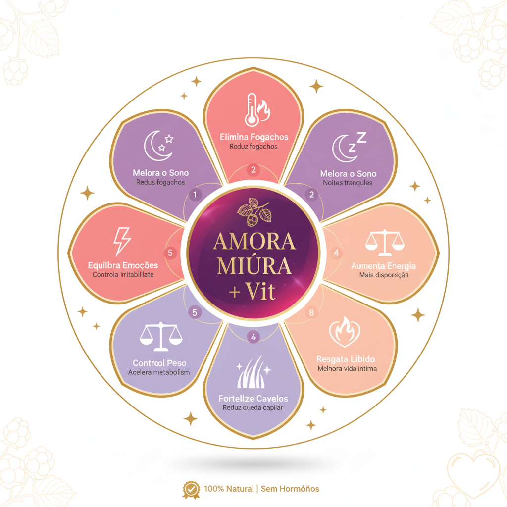 Amora Miúra + Vit é um suplemento 100% natural desenvolvido especificamente para combater os principais desconfortos da menopausa. Sua fórmula exclusiva combina o poder do extrato concentrado de amora com vitaminas essenciais que seu corpo precisa nesta fase. Sem hormônios sintéticos, sem receita médica e sem efeitos colaterais, este produto tem transformado a vida de milhares de mulheres que decidiram não aceitar o sofrimento como parte da menopausa.